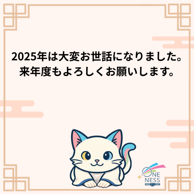 2025年もお世話になっておりました。 その他の事業 2025.12.312026.01.04 2025年も「ONENESS」の活動にご協力、ご賛同いただきまして、ありがとうございました。 来年、2026年も変わらぬご愛顧、ご指導、ご鞭撻のほどよろしくお願いします。